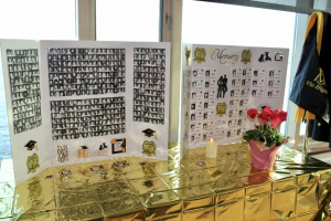 Hung right alongside Hermann’s jazz memories were our Class of ’68 memorabilia courtesy of Jackie Dobbyn Martin. Sandi Mottishaw Duncan and Jackie created jazzy centerpieces to bring some good old black and gold into the venue. Joe Lindo’s DVD of photos from our ’68 Camosun ran on two TV’s.