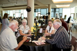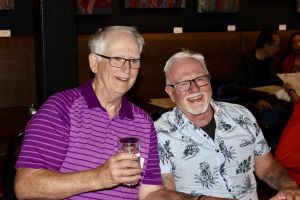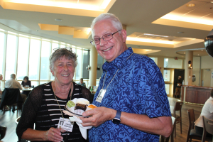 Jeanne Elliot presented Hamish Robertson with a prize for traveling the greatest distance to attend and to Ted Bird for being married the longest.