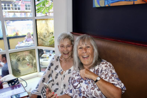 It definitely looks like it was worth the wait as the Class of 1970 finally held its 50th reunion. So many smiles and hugs and laughter and stories, it was a treat to be at the May 31 Meet & Greet at the Strathcona Hotel. Our enthusiastic Vic High Alumni merch team was there too – Mary Anne Skill and Shannon Edgar, VHS 1975 – representing the Alumni and selling branded items to attendees. And as all these folks were at Vic High when I was there, it was such fun to see so many (yes, still) familiar faces. (And how about that cake! Thrifty’s outdid themselves recreating the Vic High logo.)